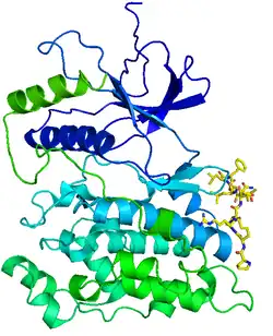 c-Jun N-terminal kinases (JNKs), were originally identified as kinases that bind and phosphorylate c-Jun on Ser-63 and Ser-73 within its transcriptional activation domain. They belong to the mitogen-activated protein kinase family, and are responsive to stress stimuli, such as cytokines, ultraviolet irradiation, heat shock, and osmotic shock. They also play a role in T cell differentiation and the cellular apoptosis pathway. Activation occurs through a dual phosphorylation of threonine (Thr) and tyrosine (Tyr) residues within a Thr-Pro-Tyr motif located in kinase subdomain VIII. Activation is carried out by two MAP kinase kinases, MKK4 and MKK7, and JNK can be inactivated by Ser/Thr and Tyr protein phosphatases.[1] It has been suggested that this signaling pathway contributes to inflammatory responses in mammals and insects.