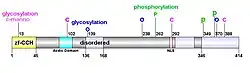 Uncharacterized protein Chromosome 12 Open Reading Frame 50 is a protein in humans, encoded by the C12orf50 gene. The protein accession id is Q8NA57. The protein has a length of 414aa. The predicted mass of the protein is 47.2 kDa.[9] The protein includes a CCCH-type Zn Finger Domain.[10] The protein has a CCCH-type Zn Finger Domain with a C-X8-C-X5-C-X3-H motif. The domain starts at the beginning of the protein and goes to the 44th amino acid. The protein also has three disordered regions from the 136th amino acid to 168th with of length of 33 aa, 297th to 333rd with a length of 37 aa, and 346th to 414th with a length of 69 aa.[11] The predicted molecular weight is 47.3 kDa and the predicted isoelectric point is 8.79.