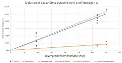 C12orf50 has an evolutionary rate that is close to Fibrinogen alpha, making it relatively quick. Orthologs for C12orf50 have been found in mammals, reptiles, birds, and amphibians caecilians. No orthologs were found for frogs, fish, invertebrates, or fungi. The mammalian orthologs shared the most similarity with humans with the exception of the platypus. The range of divergence from humans from mammals was 6.4-180 million years. The reptilian orthologs were the next similar and diverged around 318 million years ago. Then the birds diverged from humans at the same time as the reptiles. The least similar was the amphibian caecilians and they diverged around 351.7 million years ago.
