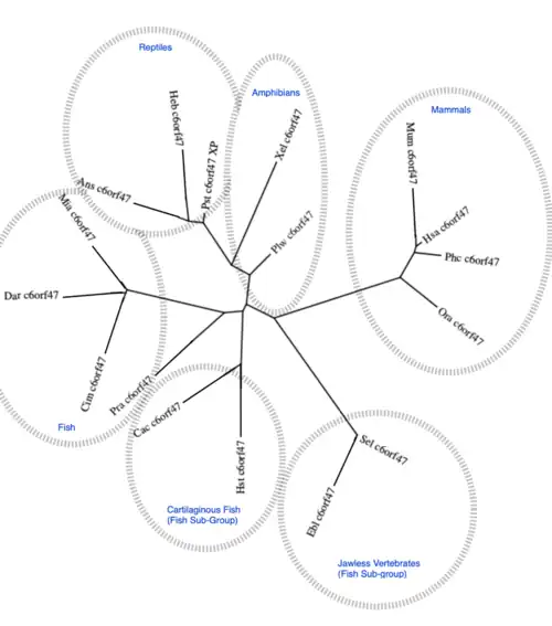 C6ORF47 gene is estimated to have first appeared approximately 563 million years ago (MYA) in lampreys. C6ORF47 was found in ray-fined fish (actinopterygii), cartilaginous fish, lampreys, and lobe-finned fish (sacropterygii), but no hagfish suggesting that possibly this gene was inserted into lampreys. C6ORF47 is conserved to vertebrates with no traces of it being present before vertebrates as seen by its oldest ancestor lampreys (563 MYA). The C6ORF47 gene evolved quite rapid since it was shown to evolve slightly slower than Fibrinogen Alpha and it much faster than Cytochrome C. Orthologs used for this diagram included Human, House Mouse, African Bush Elephant, Koala , Painted Turtle, Eastern Brown Snake, Iberian ribbed newt, West African Lungfish, Danio rerio, Seven-gill Sharpnose Shark, and Sea Lamprey) (See Time-Calibrated comparative date of divergence diagram located to the down to the right).