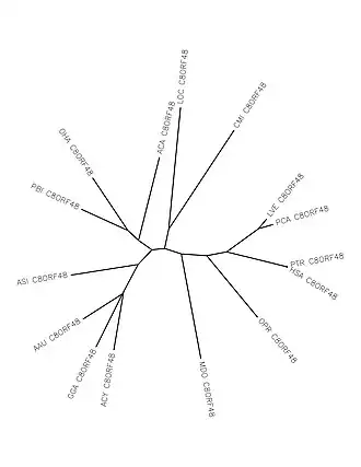 C8orf48 is conserved in mammals, amphibians, reptiles, aves, and fish.[22] C8orf48 orthologs were unable to be found in bacteria, archea, plants, and fungi.[22] There were no human paralogs found of C8orf48. Certain portions of the DUF 4606 domain is highly conserved in the orthologs.