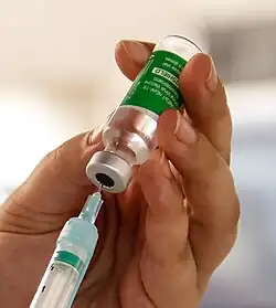 On 1 January 2021, the Drug Controller General of India (DCGI) approved emergency use of the Oxford–AstraZeneca vaccine (local trade name "Covishield").[16][17][18] On 2 January, the DCGI also granted an interim emergency use authorisation to BBV152 (trade name "Covaxin"), a domestic vaccine developed by Bharat Biotech in association with the Indian Council of Medical Research and National Institute of Virology.[19] This approval was met with some concern, as the vaccine had not then completed phase 3 clinical trials.[20] Due to this status, those receiving Covaxin were required to sign a consent form,[21] while some states chose to relegate Covaxin to a "buffer stock" and primarily distribute Covishield.[22]