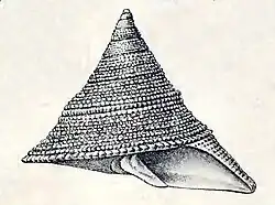 The marked features are the concavity of the slope of the spire and of the outer portion of the base, the polished base contrasting with the regularly beaded upper surface, and the delicately notched carina at the periphery.[3]