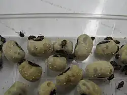 The predators of C. maculatus include several parasitoid wasps. Anisopteromalus calandrae, Uscana mukerjii, and Dinarmus wasps specifically target Callosobruchus species.[22][23][24] Dinarmus basalis parasitizes small larvae and halts their development. This limits the damage they can do to beans, but their presence still makes the beans unfit for human consumption and usually makes them unfit for sowing, as well.[22] Uscana mukerjii is an egg parasite which prevents the egg from hatching, thereby preventing damage to the legume.[24]
