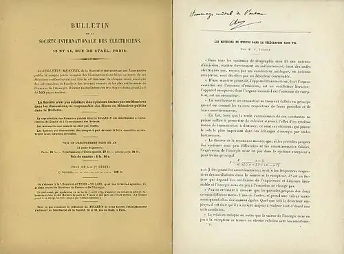 In 1896, when the work of Lodge and of Marconi concerning wireless telegraphy was still little known, Tissot undertook parallel and independent research. He built apparatus for radio experiments with the assistance of E. Branly and of the manufacturer Eugene Ducretet for whom later he will develop apparatus.