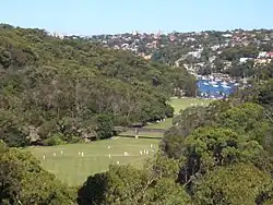 Cammeray has developed into somewhat of a home for rugby league on the North Shore with the North Sydney Bears headquarters Norths Cammeray being located in the suburb. Tunks Park, home to junior rugby league club the North Sydney Brothers. Tunks Park is located in Cammeray, although the North Sydney Junior Rugby League website lists it as being in nearby Northbridge.[11][12] Tunks Park is a large recreation and sporting area that is surrounded by bushland with Middle Harbour to the east. It provides open space, walking tracks, playground and picnic areas and has three sporting fields that are used for cricket during the summer and soccer, rugby league and rugby union during the winter. It is a popular exercise and dog walking area with bushwalking tracks that lead towards Naremburn to the west and Northbridge to the north. A small public boat ramp allows small boats to enter Middle Harbour.[13]