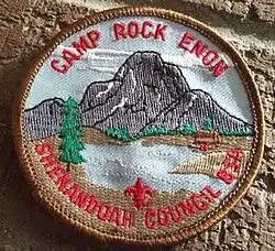 The summer camp programs include: aquatics (swimming, kayaking, stand up paddleboarding, canoeing, rowing, BSA Lifeguard, mile swim, polar bear swim, water carnival, and Aquaglide), backpacking, biking, camp wide games, camping, canyoneering, cooking, CRE elite, Firem'n Chit, Frontier program covering first year camper skills, fishing, handicraft (leatherworking, woodcarving, basketry), high adventure programs, hiking, hiking trails, Indian lore, Mountain Man Program including blacksmithing, nature, orienteering, overnight outpost adventures, Paul Bunyan, pioneering, rock climbing & rappelling on on-site natural rock, the Eight-Face Challenge Rock Climbing Program, safe swim defense, safety afloat, Scoutcraft, shooting sports (archery, rifle, shotgun), Totin' Chip, space exploration, volleyball (sand), wilderness survival, and youth leadership training.[14][15][16] Camper family members are invited to visit the camp on Friday nights for dinner; a Scout performed campfire program with skits, songs, and jokes; then an Order of the Arrow Callout Ceremony. Each Sunday evening at the camp chapel a short non-denominational service called Vespers is held. Units from Maryland, Pennsylvania, Virginia, and West Virginia most often frequent the property.[23] The Camp participates in Scouting's International Scout programs, and has had Staff from the United Kingdom, Poland, The Netherlands, Egypt, Mongolia, Mexico, the Dominican Republic, and Columbia in recent years. In 2010 campers spent 9,034 nights at Camp Rock Enon.[13]: 2