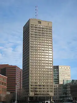 Professor Herbert L. Beckwith was named architect of the project and he proposed a pair of towers on a riverside plot between Memorial Drive and the Kresge Court.[60] Construction required the relocation of a Catholic nursing order, busy parking lot, and existing student housing. Building was broken into two phases: the West Wing was completed in 1963 and the East Wing was completed in 1968. The towers are connected by public spaces like a dining hall, dance studio, and music room at the ground floor.[59] The building has attracted some criticism for its inefficient use of space, but it was renovated in the late 1990s.[59][61]