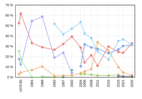 | Election | Liberal | Conservative | New Democratic | Green | People's | PC | Reform / Alliance | Bloc Québécois | Social Credit | Others |