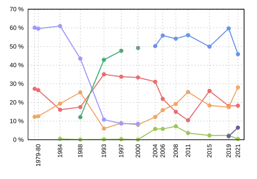 | 1997 | 109,932 33.8% | — | 28,814 8.9% | 827 0.3% | — | 28,337 8.7% | 155,133 47.7% | 2,515 0.8% |