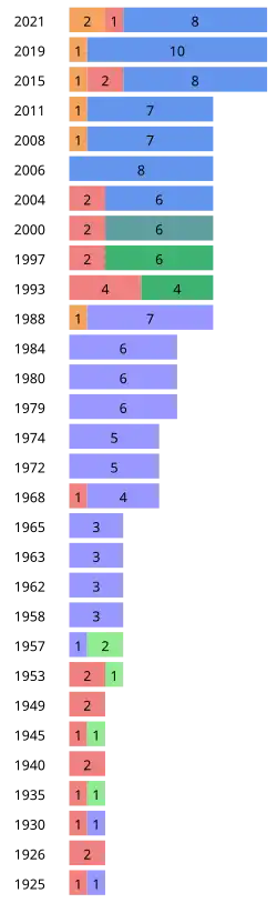 | Election | Liberal | Conservative | New Democratic | Green | People's | PC | Reform / Alliance | Others |