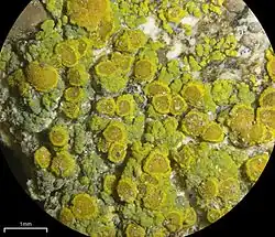 Candelariella vitellina often has tiny lobate areoles in the shape of lion claws.[2] The areoles may be flat or convex.[2] Its sexual reproductive structures (apothecia) are a 0.35–1.0 mm-wide disc, darker yellow than the thallus, rimmed with thallus-like tissue (lecanorine), flat but becoming convex with age.[2] The results of lichen spot tests are K+ reddish, KC−, and C−.[2] It produces calycin, pulvinic acid, pulvinic dilactone and vulpinic acid as secondary metabolites.[2]