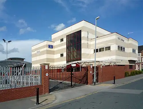 Hull Cannon Street station closed to passengers on 14 July 1924,[2] after the London and North Eastern Railway had built the Spring Bank chord to Hull Paragon, and passenger services were diverted there. It closed completely on 3 June 1968. The wooden passenger buildings had disappeared by the late 1970s, the goods office which stood parallel to the street was demolished after 2002. In 2005 Hull College has built motor vehicle workshops for training purposes on the site. Only one set of the iron entrance gates with the original company legend has been reused as the main entrance to the new facilities.[1]