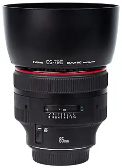 The Canon EF 85mm f1.2L II USM, with its included hood in place