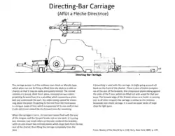 For use on the upper deck, there were three models of a directing bar carriage (affût à flèche directrice). These were named for a bar (flèche) that traversed on a pivot near the hull in front of the gun. In firing position, this lifted the upper carriage off the deck, making it easier to aim the gun horizontally.[28] The first carriage was made of wood, later ones of iron. However, this type of carriage soon proved inconvenient for guns that were as heavy as the 19 cm M 1864 and 1870, and so these carriages were abandoned.[29] The last model of these carriages could elevate the gun to 20°, decline it to 5° and weighed 2,835 kg.[30]