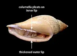 The shell is moderately elongate, with variable width and spire height. The aperture is long and narrow, accounting for well over half the shell’s length. The spire is conical, and the sculpture is cancellate (hatched), consisting of relatively fine axial ribs and spiral cords of nearly equal strength. Much of the ventral surface is covered by a thin, transparent glaze extending from the inner lip. The inner lip features numerous columellar pleats that become progressively stronger toward the anterior. The outer lip is slightly reflected, with a thickened inner margin bearing numerous ridge-like denticles.[2]