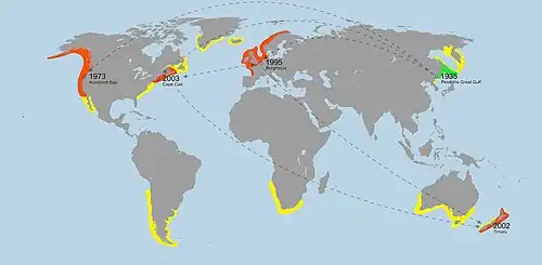Since then, additional populations have been detected in Belgium (1998), Norway (1999), Germany (2000), Scotland (2000), England (2003), Wales (2003), Ireland (2003), France (2004), and Denmark (2005).[11][50] They exist in extremely dense populations and are all associated with areas of high human activity. They are believed to have been introduced through shipping and aquaculture equipment from the United States and Asia. As of 2011, there have been no recorded sightings of C. mutica around the Iberian Peninsula, the Baltic Sea, or the Mediterranean Sea.[33]