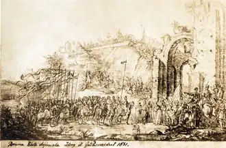 The following day, the Field Hetman triumphantly entered Kyiv through the Golden Gate. He was ceremoniously welcomed by the Orthodox clergy, led by Metropolitan Sylwester Kossów and Archimandrite of Pechersk, Józef Tryzna, as well as the local magistrate, who presented the prince with the keys to the city and swore allegiance to the king and the Polish-Lithuanian Commonwealth.[4][2]