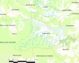 Caramany is located in the canton of La Vallée de l'Agly and in the arrondissement of Perpignan.