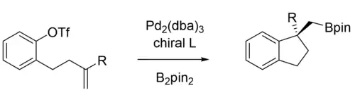 - ^ a b Liu, Z.; Ni, H. Q.; Zeng, T.; Engle, K. M. (2018). "Catalytic Carbo- and Aminoboration of Alkenyl Carbonyl Compounds via Five- and Six-Membered Palladacycles". Journal of the American Chemical Society. 140 (9): 3223–3227. doi:10.1021/jacs.8b00881. PMC 6002770. PMID 29384373.
