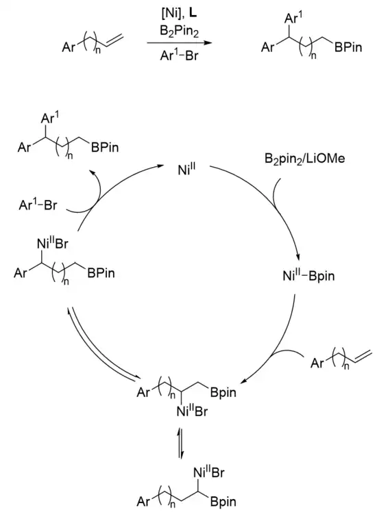 - ^ Ye, Y.; Lin, Y.; Mao, N. D.; Yang, H.; Ye, X. Y.; Xie, T. (2018). "Recent progress in nickel-catalyzed carboboration of alkenes". Organic & Biomolecular Chemistry. 140 (9): 3223–3227. doi:10.1021/jacs.8b00881. PMC 6002770. PMID 29384373.