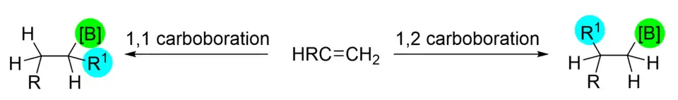 1,1 carboboration delivers both the carbon-carbon bond and the carbon-boron bond to the same carbon in the substrate. It requires a 1,2-migration of a substituent from one carbon to the other in the double bond. The Wrackmeyer reaction is typically credited as being the pioneering example of 1,1 carboboration and utilizes a metal migrating group to help facilitate the transformation.[1] However, there are several modern examples of carboboration with a variety of migrating groups.[2][3]