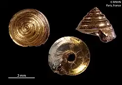 The size of the shell varies between 2.7 mm and 4.4 mm. The shell thin, transparent, glossy, but not nacreous forms a depressed cone. Its color is glassy. The shell is umbilicated and rather smooth. The sculpture of the shell shows a single, sharp keel round the periphery, showing at the base of the spire-whorls. The shell has a thread-like spiral rib below the rather deep suture of each whorl (varying in position), numerous but slight flexuous striae below the rib, and in some specimens minute close-set curved longitudinal striae on the upper whorls. The base is nearly smooth or marked only with microscopic lines of growth. The seven whorls of the short spire are compressed, slightly shouldered by the infrasutural rib. The body whorl is disproportionally large, and the first is globular. The narrow aperture is rhomboidal, angulated in the middle by the keel, and below by the base of the columella. The outer lip is thin. The inner lip filmy and spread on the base. The columella is very short and incurved. It is furnished near the bottom with a small tooth-like process, below which is a short notch. The groove is broad, apparently not deep. It occupies the middle of the body whorl between the suture and the peripheral keel. The umbilicus is narrow but deep, exposing all the whorls, encircled and defined by a slight rib. [3][4]