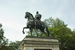 Catherine the Great reviewed Rastrelli's work in 1763, but disliked it. Only in 1800, her son Paul installed the monument in front of his Saint Michael's Castle.[1] He ordered to add the inscription "From great grandson to great grandfather" to the pedestal, which was already decorated with bas-reliefs depicting scenes of Russian victories during the Great Northern War.[7]