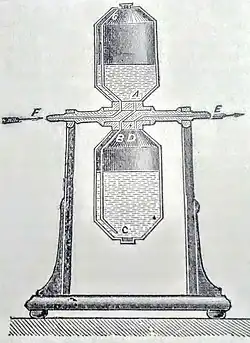 Marangoni simplified the aspirator for the measurement of gas. A common flaw in aspirator were inaccurate measurements caused by ascending of air or gas through descending liquid. The perfected device uses a couple of vessels attached to a fixed horizontal shaft, FE, which rests on two erect supports. The shaft has various passages which conducts the functions of the taps. The water of the above receptacle releases into the bottom receptacle by passage A, and through the tube, BC, issuing at the lowest extremity at C. The air within the bottom vessel is omitted by the passage DE, cut into the shaft, meanwhile the air or gas is aspirated in the identical ratio by the passage, FG.[1]