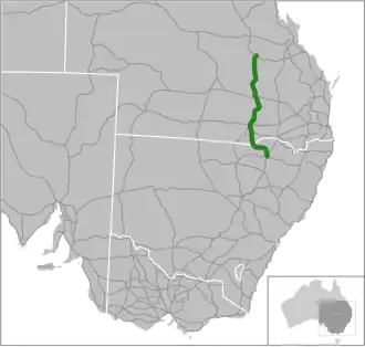 The passing of the Main Roads (Amendment) Act of 1929[4] (which amended the original Main Roads Act of 1924[5]) through the Parliament of New South Wales on 8 April 1929 provided for the declaration of State Highways, Trunk Roads and Main Roads, partially funded by the State government through the Main Roads Board (later the Department of Main Roads, and eventually Transport for NSW). Main Road 232 was declared on 21 November 1933, from the intersection with Main Road 338 (Moree-Boggabilla Road, later to become Newell Highway) at Moree, via Ashley, Garah and Boomi to the state border with Queensland at Boonangar,[2] and Main Road 367 was declared on 23 March 1937 from the intersection with Main Road 232 at Garah to the state border with Queensland at Mungindi.[6]