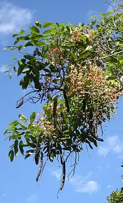 Flowers are yellow, often with red markings, and produced in racemes. The flowers are followed by round pods, up to 45 cm long.[2]