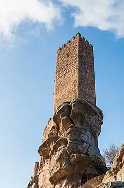 The castle stands on a large rock in the Vega de Zafra at an elevation of 1,400 metres (4,600 ft) in the Sierra de Caldereros. The upland area is characterised by sloping meadows interspersed with heavily-eroded sandstone outcrops, one of which is occupied by the castle.[3] It occupies the whole of the outcrop, which runs in a north-east to south-west alignment. A wall encloses the top of the outcrop, linking the entrance tower at the south-west end to the main buildings at the north-east end.[4] Traces of buildings – possibly part of an outer enclosure that might have incorporated structures such as stables or supply stores – can be seen in the meadow surrounding the castle.[5]