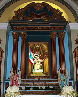 One of the most culturally important chapels of the cathedral, it contains a shrine that is dedicated the national image of Our Lady of Providence, patron and protector of Puerto Rico, together with the flag of Puerto Rico. The current statue dates to 1853. Next to it is an inscription that reads: Our Lady of Providence, Protector of Puerto Rico (1853-1953).[19][5] Our Lady of Providence was declared national patron of Puerto Rico on November 19, 1969 by Pope Paul VI, on a decree that states the celebration of this Marian icon on November 19.[14] This chapel is an officially declared national shrine that contains the icon of said national patron while the planned National Shrine of Our Lady Mother of Divine Providence (Santuario Nacional de Nuestra Señora Madre de la Divina Providencia) is being built in the Cupey barrio of San Juan, Puerto Rico.[20]