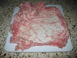 Caul fat, also known as lace fat, omentum, crépine or fat netting, is the thin membrane which surrounds the internal organs of some animals, such as cows, sheep, and pigs, also known as the greater omentum in anatomy textbooks. It is used as a casing for sausages, roulades, pâtés, and various other meat dishes.[1] Examples of such dishes are Vietnamese bò nướng mỡ chài, Swiss atriau,[2] French crépinette,[3] Cypriot sheftalia, South African skilpadjies, British faggots,[1] Serbian plućna maramica and trbušna maramica, and Italian fegatelli. In the traditional Ukrainian and Russian cuisine, caul fat, known as salnik or salnyk, was usually filled with kasha and liver, and baked in a clay pot in the Russian oven.[4] The Navajo people of the Southwestern United States wrap sheep intestines around strips of caul fat to make a dish called ach'ii'.