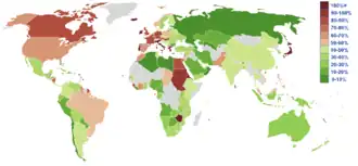 - USA household debt as a percentage of annual disposable personal income was 127% at the end of 2007, versus 77% in 1990.[67]