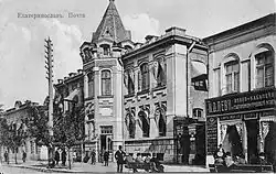 The post office was situated on Starodvoryanskaya Street in the early part of the 19th century (currently a location on 12 Plekhanov Street). Constructed in the early 1800s, the post station's one-story building was later rebuilt to include a mezzanine superstructure. Numerous important moments in the development of postal and telegraph communication history took place at the building. The first postal stamps issued in the Russian Empire arrived here and in other towns in December 1857.[2] In this building's wing, on 8 October 1859, Ekaterinoslav's first postal and telegraph station opened. This location saw the operation of the first telephone exchange on 24 November 1897.[3]