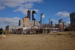 Work on the inland section of Chelsea Waterside Park, atop the former Smith Park, began in July 1998 with the demolition of buildings for the park expansion north of 23rd Street.[91] Park construction began in September 1998,[51] with the western stretch of 23rd Street closed to traffic in February 1999.[92] The inland park was opened on October 12, 2000, at the cost of $8.5 million. Upon opening, the park was proclaimed as "Chelsea's grand portal to its waterfront" by New York State officials.[7] The park's features at its opening were the sports field, dog run, and the splash pad portion of the playground.[11] Construction of the main playground within the park, however, did not commence due to lack of funding.[1]