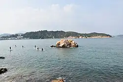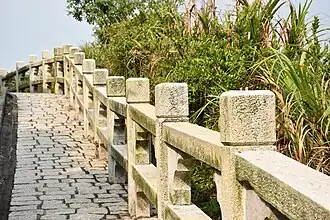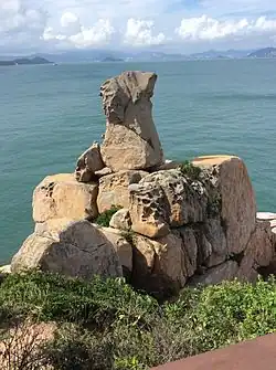 Constructed in 1997 by the Home Affairs Department, it is a part of the Cheung Chau Family Trail. The whole trail is about 850 metres long, located at the back of Kwun Yam Beach and on the headland of Chi Ma Hang, southeast of Cheung Chau. The name “Mini Great Wall” is given from the line of granite railings which looks similar to the Great Wall of China. The trail passes by a variety of specially-shaped rocks including the Loaf Rock, the Rock of the Ringing Bell, the Eagle Rock, Fa Peng Rock, Rock of the Serpent, Goat Rock, Human Head Rock, Rock of the Sleeping Crane, Rock of the Skull, Elephant Rock, Rodent Rock, Rock of the Sleeping Cat, Yuk Saai Shek, Camel Rock, Zombie Rock, and Tortoise Rock.[1]