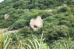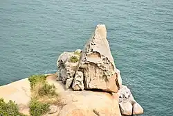 Fa Peng (花瓶, literally "Vase") Rock is one of the most famous tors in Hong Kong. The rocks were originally below the ground surface. As the main rock type in Cheung Chau is granite, chemical weathering can easily take place. Due to the presence of deep weathering profiles, granite layer on the top turned into fine-sized soil by spheroidal weathering, and granite on the bottom turned into big, rounded corestones. When the overlying soil was removed by external medium such as wind and rain, the corestone piled up and formed this vase-looking tor. Honeycomb weathering has also been taking place on Fa Peng Rock ongoingly.