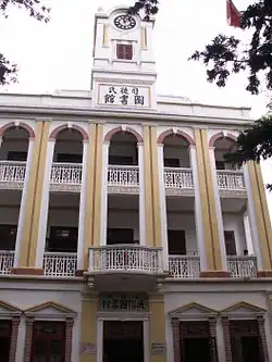 Chikan town was originally largely ran by two clans, the Situ (司徒族) and the Guan (关族), who resided in the lower and upper reaches, respectively, of the Tan River.[3] Historically the two were under constant rivalry and competition.[22] In 1923 the Situ clan built their own, though public, "Situ's Library", which opened in 1926, costing more than 30,000 silver dollars. To save their reputation, the Guan clan built their own "Guan's Library", which opened in 1931, at a similar scale to Situ's. Both libraries were funded by overseas Chinese in the 1920s and incorporated architecture features including large clocks from overseas.[23]
