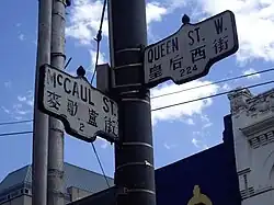 A number of streets in Downtown Chinatown are bilingual, a feature first introduced in the 1970s. The majority of these name are phonetic transliterations through Cantonese or Taishanese pronunciations into Chinese characters, while streets such as College and Queen streets are literally translated: