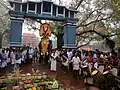 [5] The presiding deity is goddess Durga as mahishasurmardhini. The goddess proceeds to Vadakkumnathan temple starting with one elephants and nadaswaram. After reaching naduvilal number of elephants become 14 and is followed by Pandi Melam