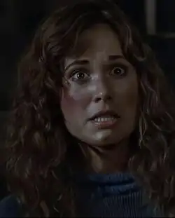 Chris made her cinematic debut in Friday the 13th Part III on August 13, 1982.[1] In this film, Chris is a young woman recovering from trauma who takes a group of friends and acquaintances to the Higgins Haven, her family homestead. Due to her trauma, she distances herself from the group and her boyfriend, Rick Bombay (Paul Kratka). In a monologue sequence, Chris reveals that two years prior, she was assaulted in the nearby woods by a severely disfigured man after a family fight and returned to her family's homestead in an attempt to face her trauma. Soon discovering that everyone is dead, Chris finds herself in a confrontation with her attacker, Jason Voorhees (Richard Brooker). After fending him off, Chris finds herself cornered in her barn. Chris drops from a beam at the top of the barn and temporarily stuns Jason. After knocking him unconscious, she hangs him and hits him in the face with a hatchet. Due to already suffering from prior trauma, the events of the film leave her hysterical.[2]