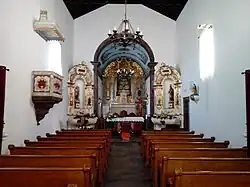 A rectangular plan, the church is composed of a single nave and lower presbytery, with a lateral square bell-tower and various annexes.[3] The spaces are deferentially covered in tile, and facades plastered and painted in white, while the corners, cornices and frames are painted in grey.
