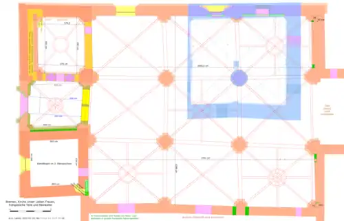 In 1220 it was mentioned as Church of St Mary, for the first time.[4] In 1219, Gerhard II had become archbishop. It is supposed that he changed the dedication and almost at the same time began to rebuild the church as a hall church. The only remainders of the buildings before are the southern tower, the ossuary cellar and parts of the inner side of the northern wall above the ossuary. Therefore, the footplans of the preceding churches are unknown. The ossuary had been built with two accesses (as typical for crypts), but its positions seems not to be typical for a crypt.