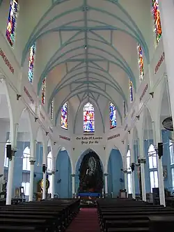 The Church of Our Lady of Lourdes was blessed and officially opened in 1888. This is the first Tamil Catholic church in Singapore. The building site was obtained in 1885 and the cornerstone laid on 1 August 1886 by Bishop Gasnier, D.D. and Sir Frederick A. Weld, G. C M. G in an official ceremony that was witnessed by a number of religious and laity. It bears a resemblance to the Sanctuary of Our Lady of Lourdes, in France. Within the Church building itself is a grotto with life-sized statues depicting the appearance of Our Lady appearing to Saint Bernadette.[1]
