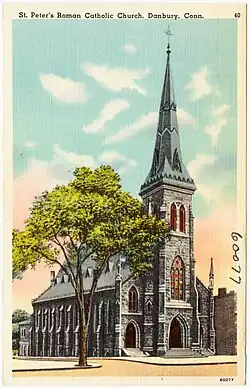 The Parish of St. Peter is the third oldest parish in the Bridgeport diocese, founded in 1851.[2] The first recorded Catholic service conducted in Danbury occurred in 1845, when Rev. Michael Lynch, of St. James in Bridgeport said Mass in the home of James Doyle of Grassy Plains. Lynch then attended Danbury on a quarterly basis. For a time, services were held in various locations: the home of James Croal on Deer Hill, the Union Hall on Main Street, and Erwins's academy.[3]