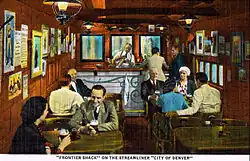 On its launch in 1936 the City of Denver used a pair of articulated trainsets built by Pullman-Standard. The streamliners would remain in service until 1953, when conventional locomotive-hauled rolling stock replaced them. The City of Denver always carried both sleeping cars and coaches. A notable feature of the 1936 version of the train was the "Frontier Shack" tavern, which had the feel of a Western saloon.