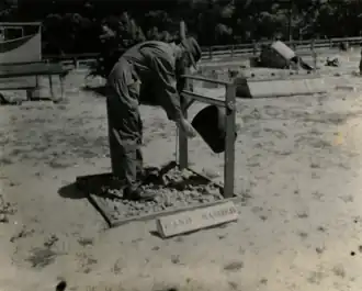 A full size civilian camp for displaced persons, occupying approximately ten acres was staked out and outlined in white tape on the Presidio of Monterrey. The camp layout was based on a recommended plan submitted to the Headquarters from the Theater.....Barbed wire fences, sanitary facilities and typical sections of barracks and other buildings were constructed in the area - with detachments participating in the construction. It was anticipated that the camp would make field problems relating to camps take on a more realistic aspect in addition to the training aid, which the actual layout would provide.[19]