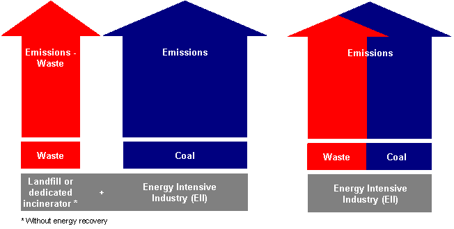 Roughly 60% of the waste that could be used for Co-processing is biomass and therefore carbon neutral. In this way Co-processing offers a significant potential for the reduction of greenhouse gas emissions from fossil fuels. Furthermore, diverting industrial waste streams from landfills and incinerators without energy recovery contributes to reducing overall CO2 emissions when used to substitute fossil fuels through Co-processing (as illustrated in the figure below).